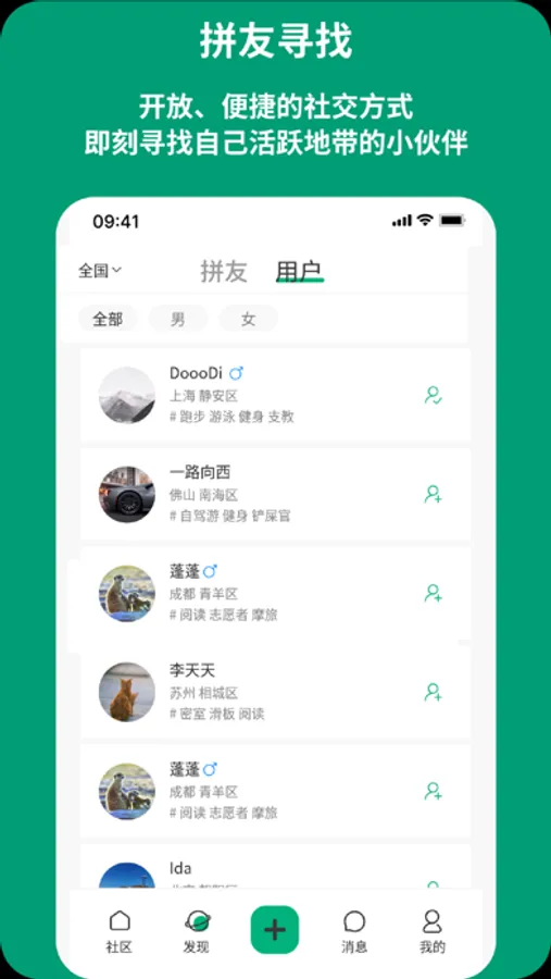 我们聚焦户外、体育、休闲玩乐、旅游、教育等场景,以绿色、健康、开放、便捷的社交理念为引导。