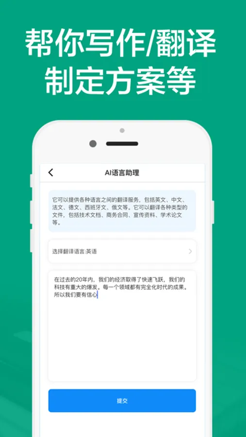 不论是实时聊天、AI翻译、创意写作、技能培训、旅游文案和攻略、写演讲稿,还是写简历求职信、担当全科老师,我们的软件都能助您一臂之力。