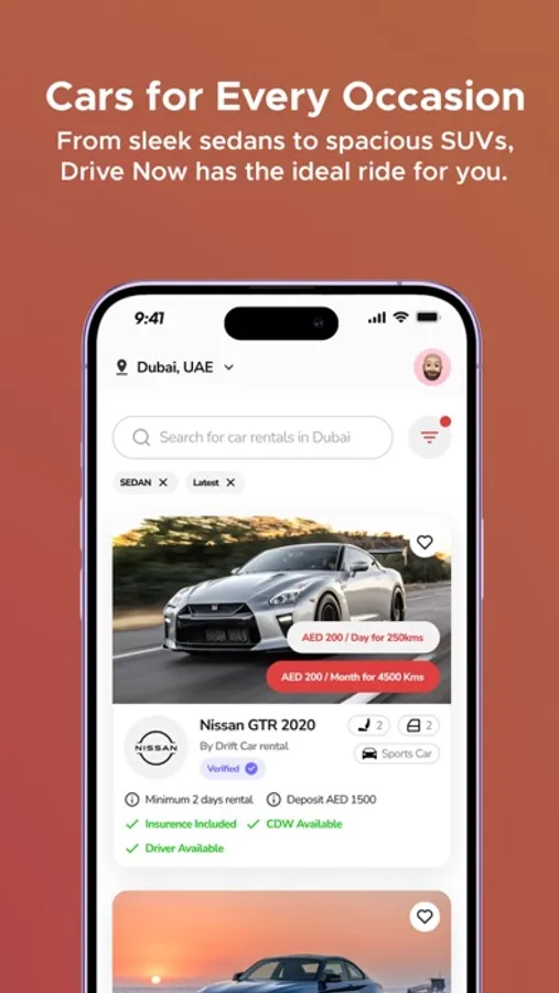 Experience the freedom of driving with Drive Now - the leading car rental app in the UAE. Discover a wide range of local car rentals with our powerful search and comparison features. Choose from over 200 verified cars in Dubai and various cities, including luxury supercars like Ferrari and Lamborghini, SUVs like Range Rover and Mercedes Benz, and economy cars such as Kia Picanto and Nissan Sunny.