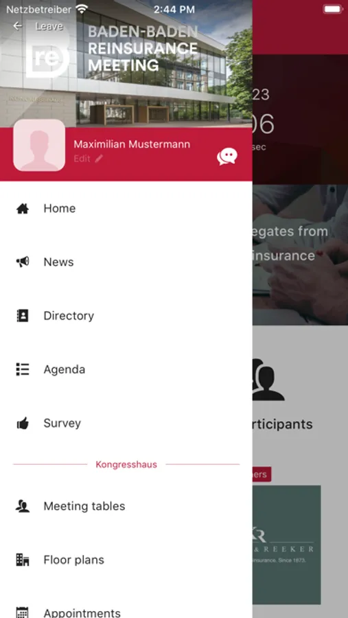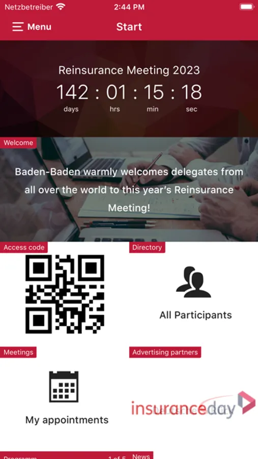 The ReinsuranceMeeting Baden-Baden app is the official meeting app concerning the Baden-Baden Reinsurance Meeting. The app is free of charge and your most important tool prior to and during the Baden-Baden Reinsurance Meeting. As a registered meeting delegate, you will find all the latest news and important information about the Baden-Baden Reinsurance Meeting at a glance in the app: