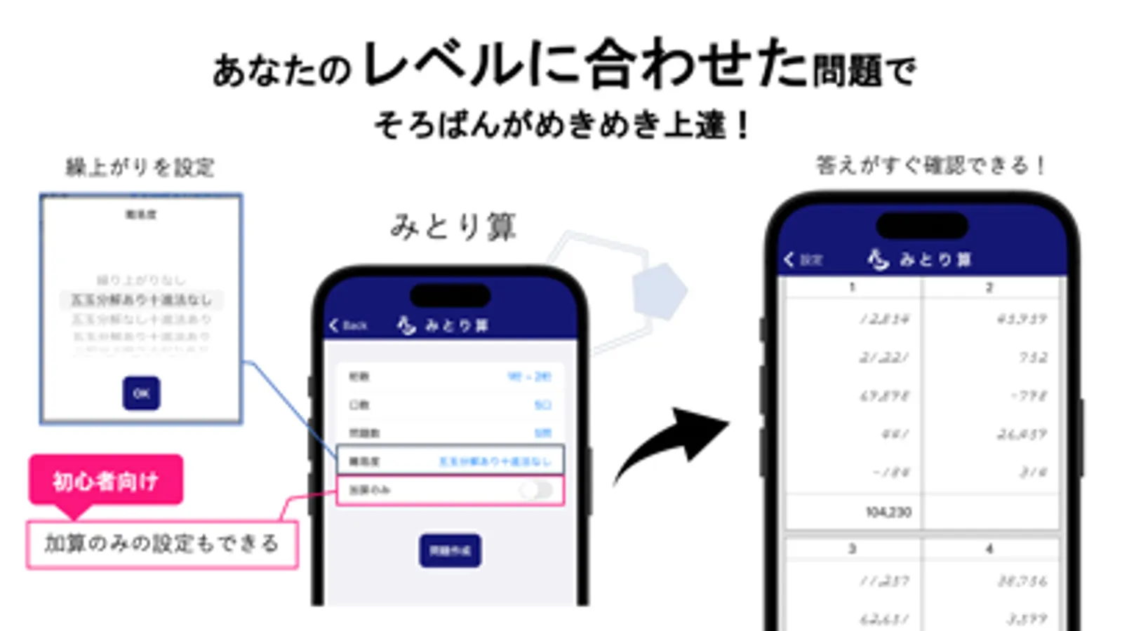 たし算、ひき算と同様、細かなレベル設定に加え、桁数の範囲を設定でき口数、問題数も自在に変更できます。