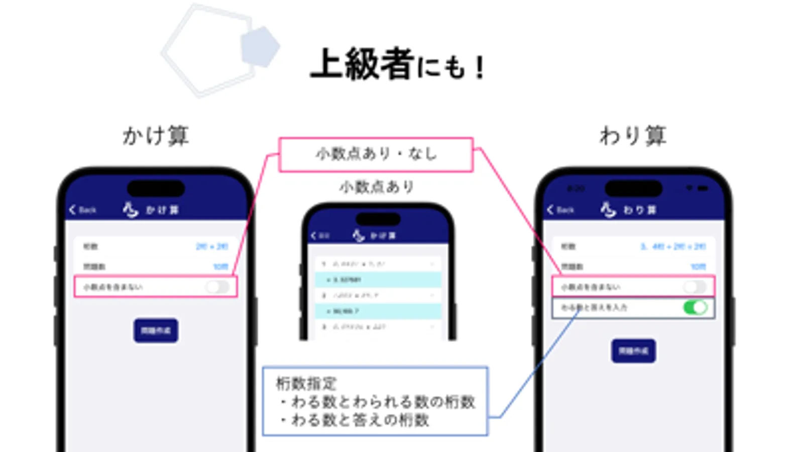 小数点の有無に加え、わり算はわる数と答えの桁数を設定するモードとわられる数とわる数の桁数を設定するモードを使用できます。検定用に自在に問題を変えることが可能です。