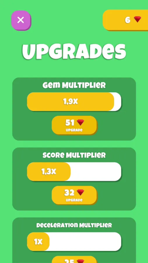Double gems for faster progress and maxed-out skills. Activate the slow motion upgrade when the speed gets overwhelming, breeze through the most challenging sections. Use the double score upgrade to maximize your high score and climb to the top of the leaderboard.