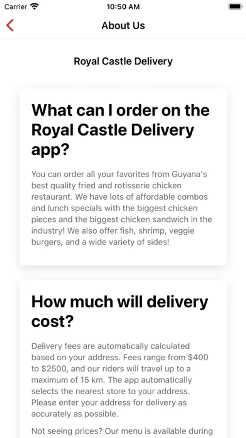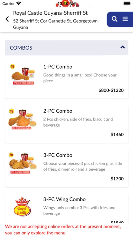 Flava down to de bone!If you ever enjoyed the unique, tempting blend of spices in Royal Castle's famous hot and tasty fried chicken, you know you are more than a customer--you are one of many raving fans! Great news: you can now order your favourite meals, specials, combos and sides from the app and sit back in comfort while the flava comes to you! Right here you can order Guyana's best quality fried and rotisserie chicken, affordable combos and lunch specials with the biggest chicken pieces and the biggest chicken sandwich in the industry! And there’s more—we also offer boneless, skinless trout fish, shrimp, veggie burgers and a wide variety of sides, including Crinkle Cut Fries, Cole Slaw, Potato Salad, Macaroni Salad, Garden Salad, Fried Rice and our famous green pepper! Delivery service is open during store hours, seven days a week. Delivery fees are calculated automatically based on your delivery location. It’s a convenient way to get the same great value and taste you have always enjoyed at our Georgetown and area stores. Purchases are cash on delivery at this time, and will be delivered by the store nearest you. If you are outside the delivery area, Sorry! The app will not process an order if you are more than 15 km from any of our Georgetown delivery locations. You will need a phone contact and address to place your order on the app. Try it now! We can’t wait to delight you with yet another convenient way to taste and savour the original and unbeatable Royal Castle flavour down to de bone!