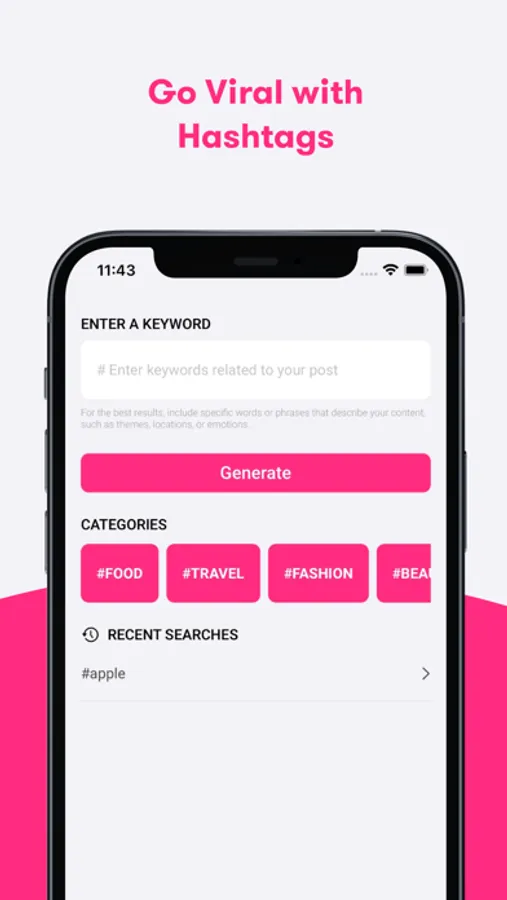 With HashtagAI, you'll gain access to an extensive library of hashtags tailored to suit any prompt or topic. Bid farewell to the days of brainstorming and let our intelligent algorithms do the heavy lifting. Simply input your prompt, and our app will work its magic, generating a diverse array of relevant and trending hashtags that align with your content.