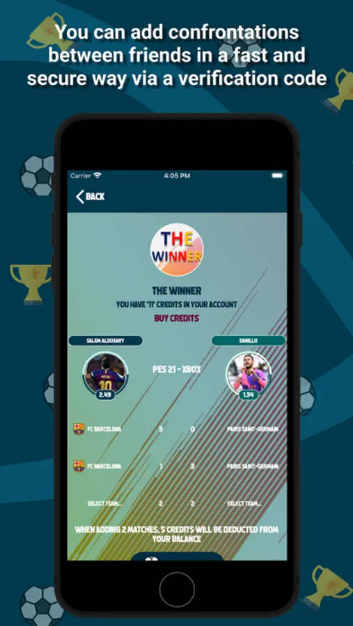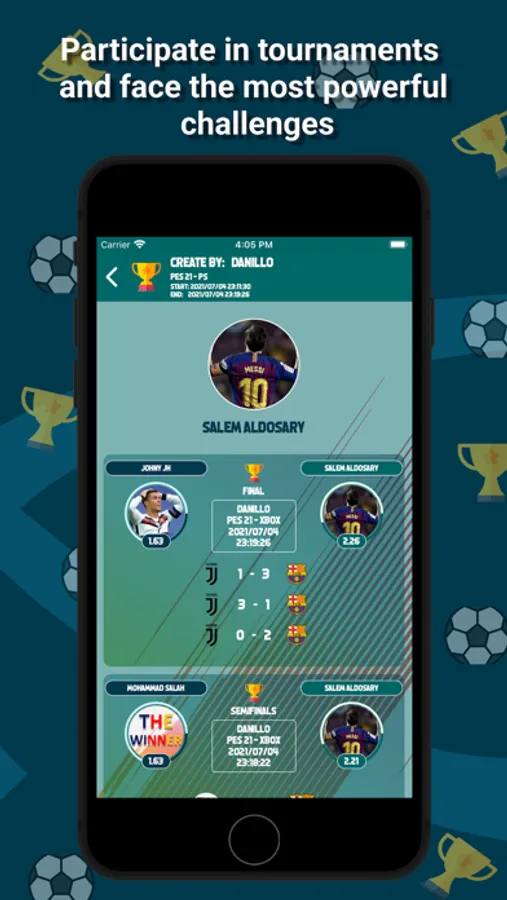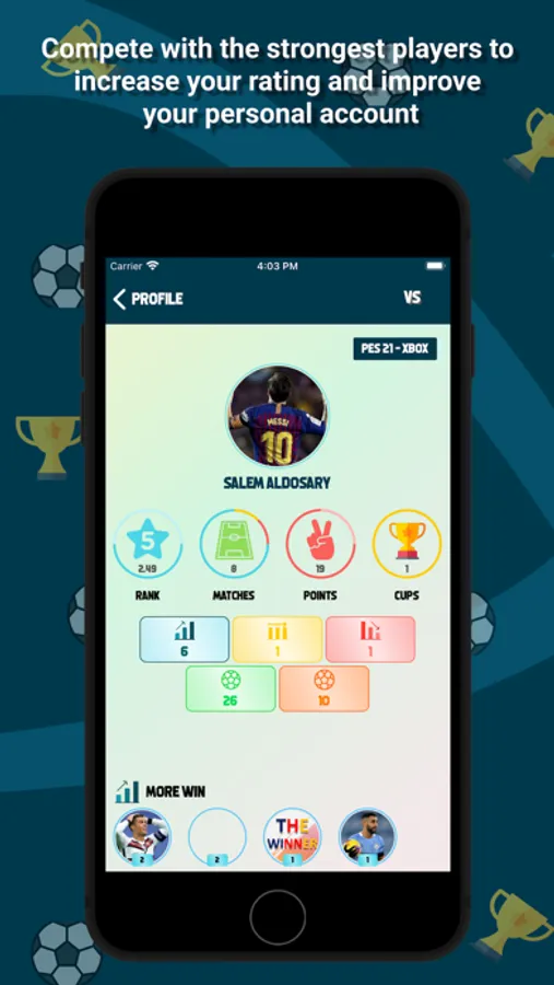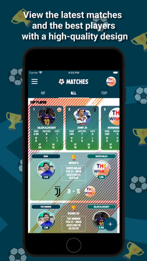 The application displays the matches and categorizes them among all the matches, the matches that have a big goal difference and the matches that the player played, in addition to a list of the top 10 players in the main interface, and a section to display the players’ ranking according to the game he prefers.