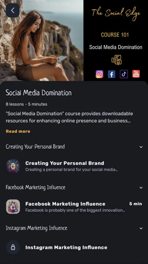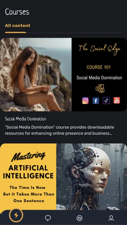 Welcome to the Social Edge app, your ultimate guide to mastering social media and enhancing your business. We know that social media can be overwhelming and intimidating, especially if you're new to the game. That's why we've designed our courses to be comprehensive, yet easy to follow, so you can gain a competitive edge in the digital world.But that's not all - we also offer an AI course to help you understand the latest developments in artificial intelligence and how to apply them in your business. In today's fast-paced technological landscape, it's more important than ever to stay up-to-date with emerging trends and technologies. Our AI course will provide you with the knowledge and skills you need to stay ahead of the curve and leverage the power of AI to your advantage.And that's not all - we believe that success in business goes beyond just technical skills. That's why we offer mindfulness and purpose courses to help you connect with your inner self and find the motivation and clarity you need to succeed. Our courses are designed to help you cultivate a growth mindset, build resilience, and overcome obstacles so you can reach your full potential.With our easy-to-follow video tutorials, downloadable PDFs, and engaging interactive quizzes, you'll be able to learn at your own pace and apply your newfound knowledge right away. Whether you're a small business owner or an entrepreneur looking to take your brand to the next level, the Social Edge app has everything you need to succeed.Join our community of like-minded individuals and start your journey towards social media mastery today. Don't wait - take advantage of our limited time offer and unlock the full potential of your business! With the Social Edge app, you'll be able to transform your business and achieve your goals like never before.