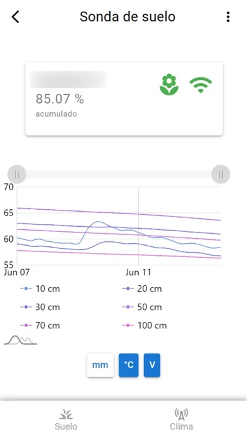 Obtén información resumida sobre las sondas de suelo, nodos y estaciones meteorológicas con nuestra aplicación LemAlfa. Accede a gráficos que representan los datos de las sondas de suelo y estaciones meteorológicas.