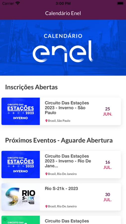 Calendário de Corridas patrocinadas pela Enel, onde é possível obter informações de cada evento.