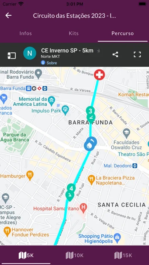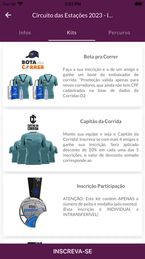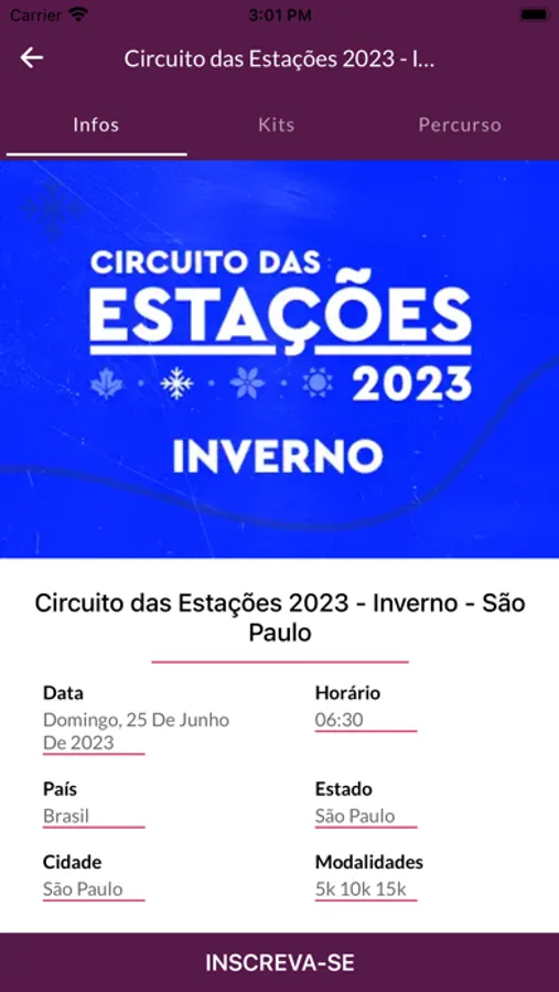 É possível verificar todas as datas importantes como data de abertura e encerramento de inscrições, data de realização da corrida, local, além de detalhes dos kits, percursos e modalidades disponíveis.