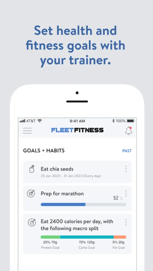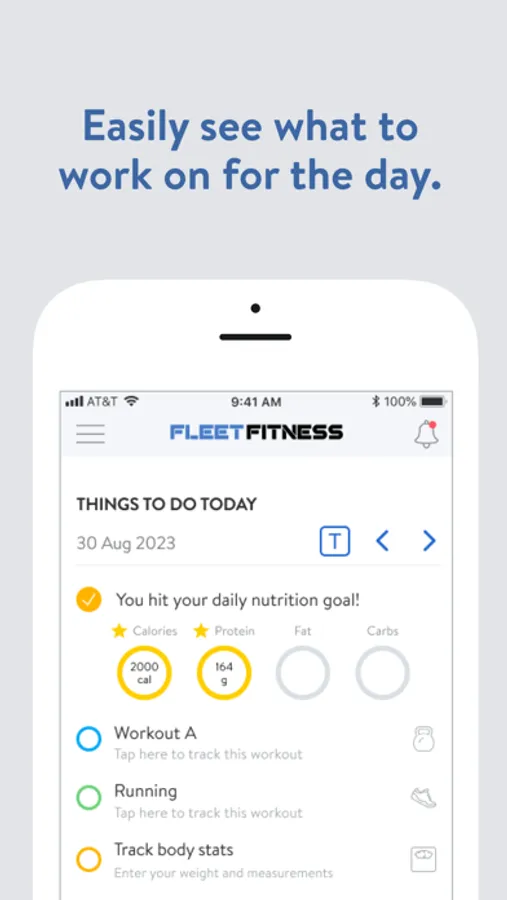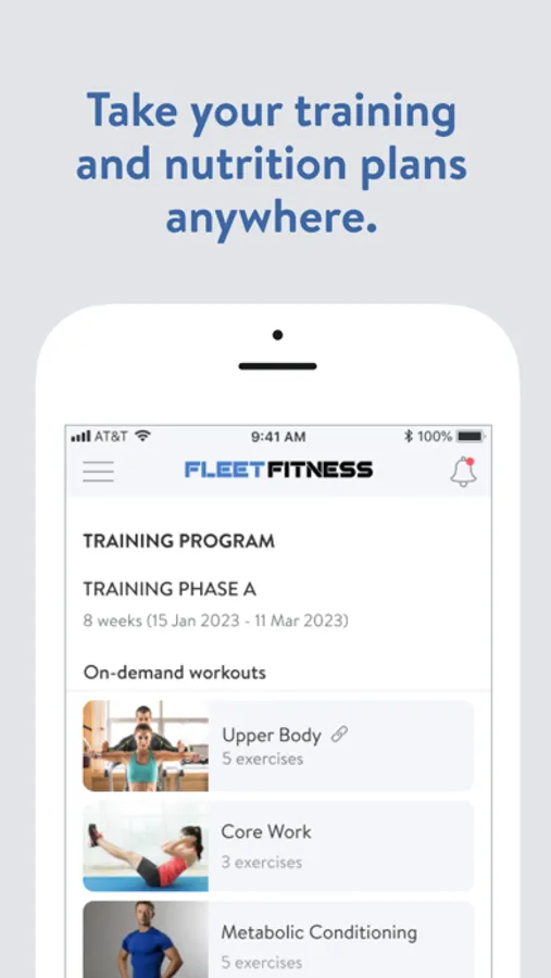With the Fleet Fitness App, you will have access to workout programs designed specifically to help you reach your fitness and health goals! You can follow & track your workouts, your nutrition, your lifestyle habits, measurements and results–all with the help of your coach.