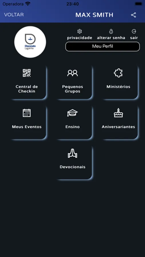 * No item Meu Perfil é possível atualizar seus dados cadastrais na Igreja;