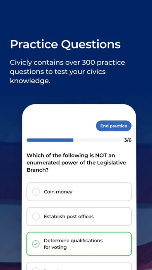 • Practice Makes Perfect: Civicly contains over 300 practice questions to test your civics knowledge