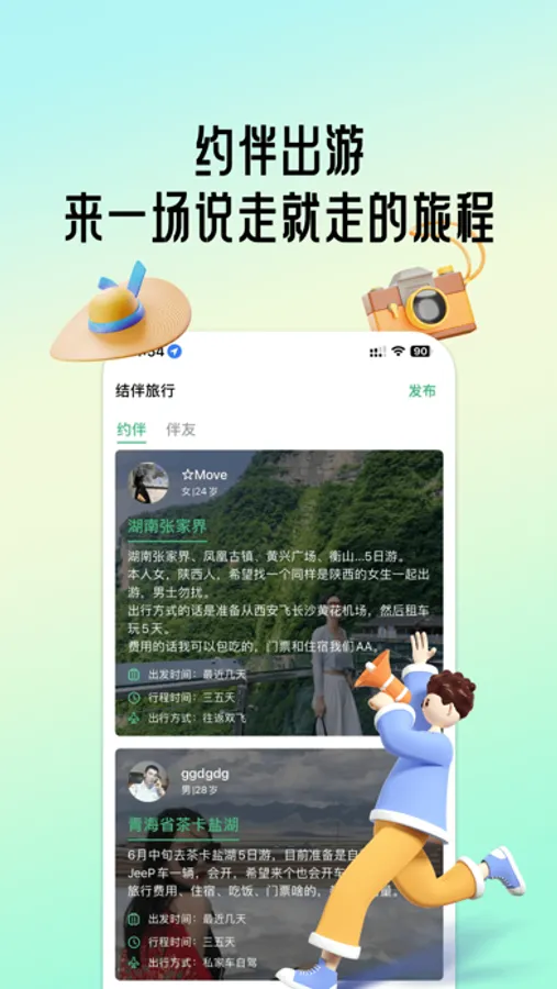 根据个人的出发时间、旅行时长、出行方式发布你的邀约信息,快速找到合拍又有趣的旅伴。