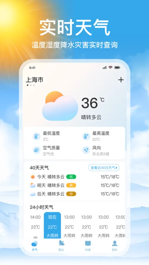 实时天气可以为您提供未来24小时及40日天气信息的应用。