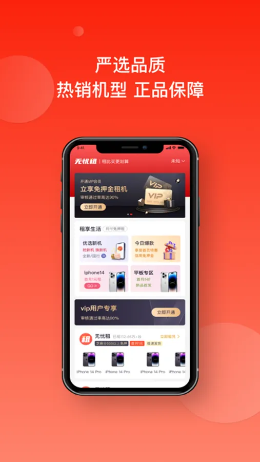 无忧租为用户提供免押金、按月付的智能手机租赁服务,每月仅需几百元就可以用上最新款手机,让用户花更少的钱买更好的手机。