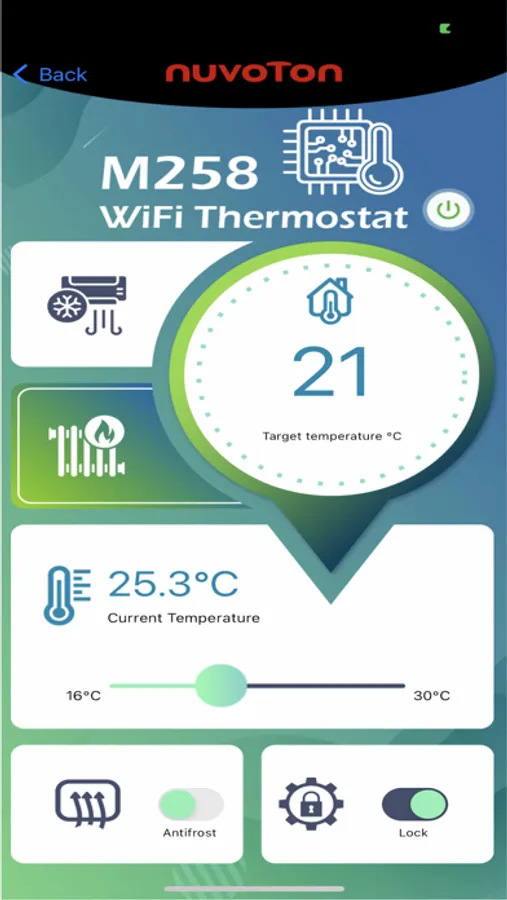 The “NuThermostat” is designed to demonstrate the compatibility with the “NuMaker-wifiThermstat-M258”.