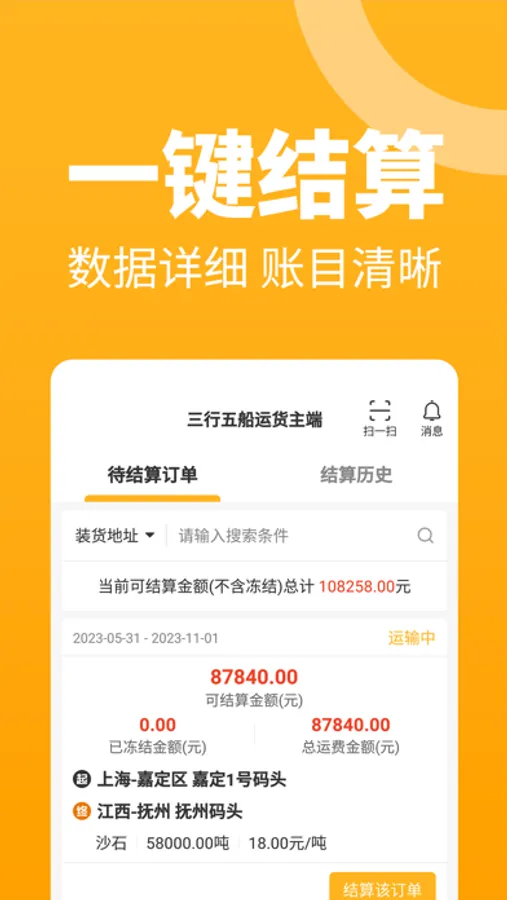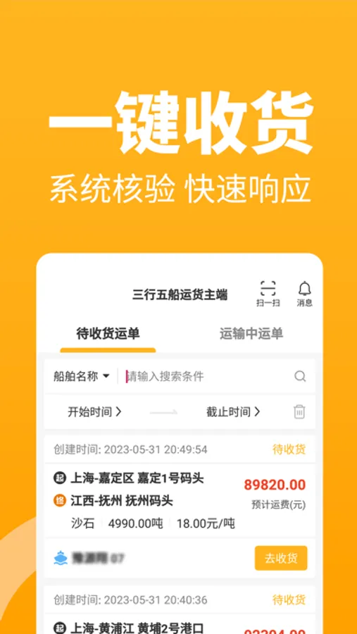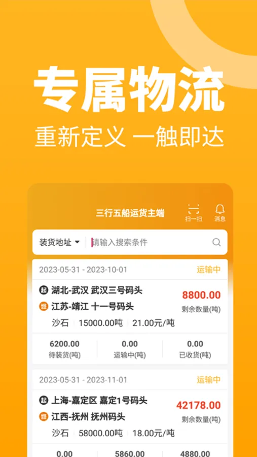 三行五船运平台依托丰富的物流经验结合物联网、云计算、大数据等信息技术将实际物流场景数字化, 为货主提供专业的物流服务. 利用移动互联网技术平台为用户提供船运货源发布、订单管理、线上收货、线上结算等一体化服务,用户可轻松在线查询管理订单和船舶的运输信息 ,线上进行货源发布, 运单收货和结算操作, 让您无论在何时何地都不会错过关键信息.
