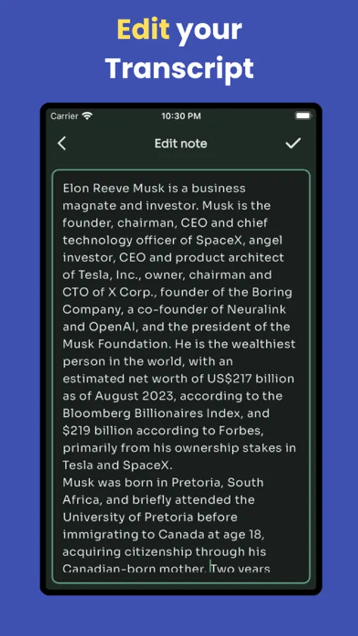 With the latest AI technologies, Vemo will transcribe your voice into any kind of content. Journal entry, cleaned up transcript, blog... Your creativity is the only limit!