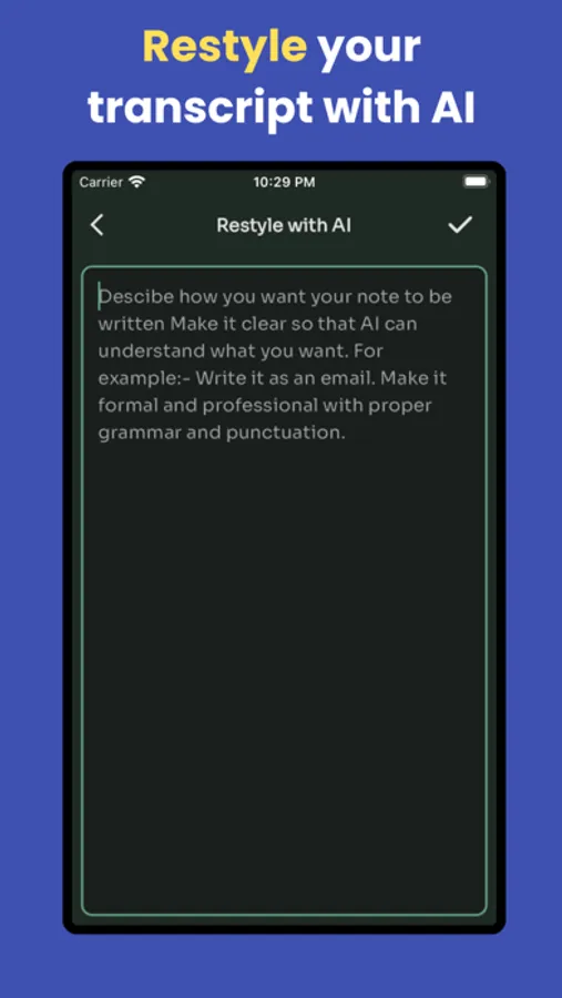 With the help of AI you can restyle your transcript any way you want. Just explain the way you want your transcript and AI will do it for you.