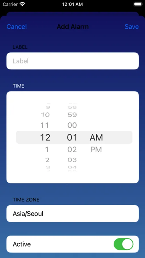 The seventh view, World Alarm, allows users to set alarms based on times in different locations, not just their own, with a simple banner notification for alerts.