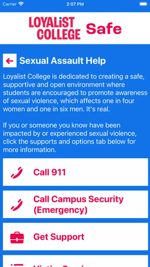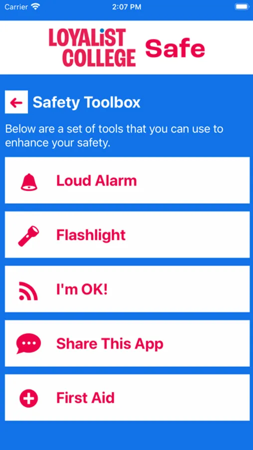 Loyalist Safe is the official safety app of Loyalist College. It is the only app that integrates with Loyalist College's safety and security systems. Campus Security has worked to develop a unique app that provides students, faculty and staff with added safety on the Loyalist College campus. The app will send you important safety alerts and provide instant access to campus safety resources.