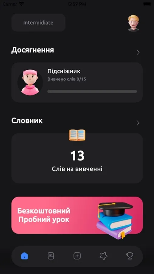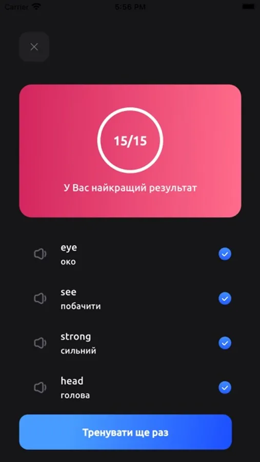 Додаток для вивчення англійських слів від Antischool Words пропонує наступні можливості: