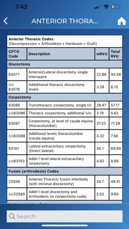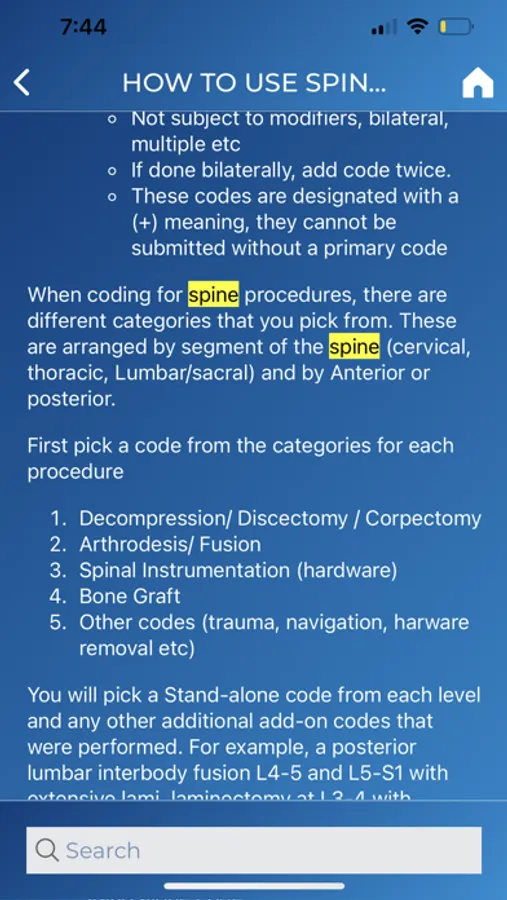 The Neurospine Coder app created by surgeons provides doctors and health care professionals a quick, easy-to-use reference library for CPT® codes relating specifically to Neurosurgery and Spine surgery. Current Procedural Terminology (CPT®) codes offer a uniform language for coding medical services and procedures to streamline reporting, increase accuracy and efficiency. Due to AMA licensing requirements to utilize the codes, this is a paid app requiring annual subscription. Capturing all possible billable codes will easily pay for itself within a single usage! Don't miss out on potential codes. This app categorizes and list all possible codes relating to each approach, and type of surgery. With an easy to navigate interface, you can easily and rapidly find your relevant codes for billing.