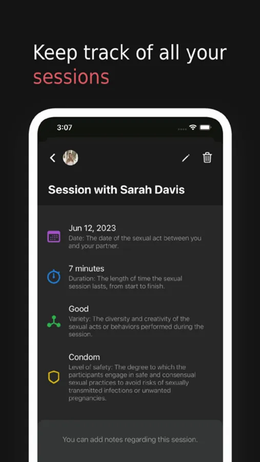 Seamless Session Management: Record and categorize your sexual encounters as sessions, setting attributes to reflect the unique aspects of each experience. Keep a detailed record of your passionate moments.