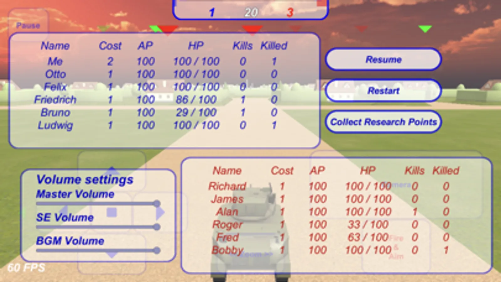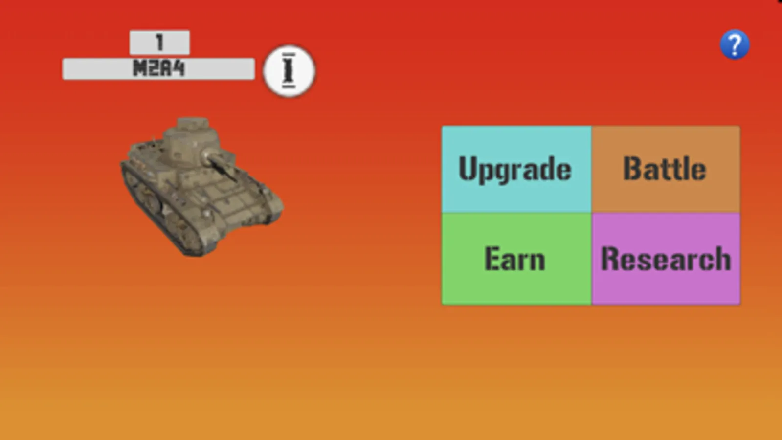Open the app and the opening screen will appear. Click the reset button to start a new game or reset progress, and the blue question mark to go to settings. If you already have a game, click on the enter button, which will take you to the hangar. In the hangar and on the left, you can see your current tank, the tank's name, level, and upgrade. Let's take a look at what certain things mean. To get a new tank go into the research tab and click on the tank. If you have enough Research Points, it will unlock and equip the tank. To get Research points you can use one of the two battle modes in the battle tab. Upgrades are important because they can boost how many Research Points you get per battle. To get money for upgrades, go into the Earn tab and click the three icons in the correct order shown above. Click them in the wrong order and you will lose money. To play multiplayer navigate from the hangar to Battle→Green Button→Multiplayer. Click Create to make a new room, or click Join to join a friend's new room. The multiplayer function can support up to four people, but all players must be on the same Wifi.