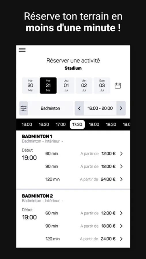 Fini la corvée de réservation ! Avec l'application tu n'as plus qu'à accéder aux créneaux disponibles et à en choisir un. Le club recevra alors automatiquement ta réservation.