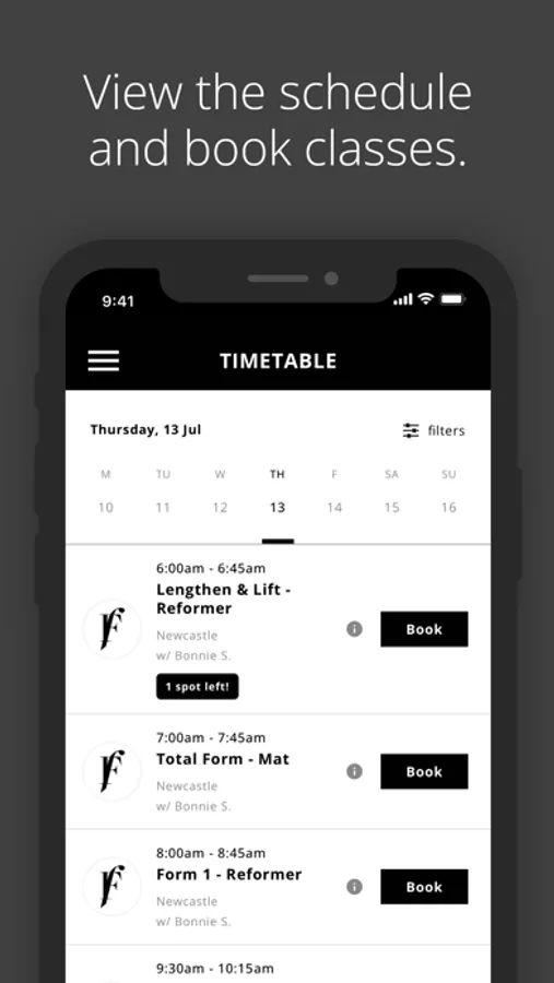 Download the Fluidform Studios App to book and manage your studio classes from your mobile. Stay organised and up to date with studio news, update your billing details and keep track of your classes in one convenient place.