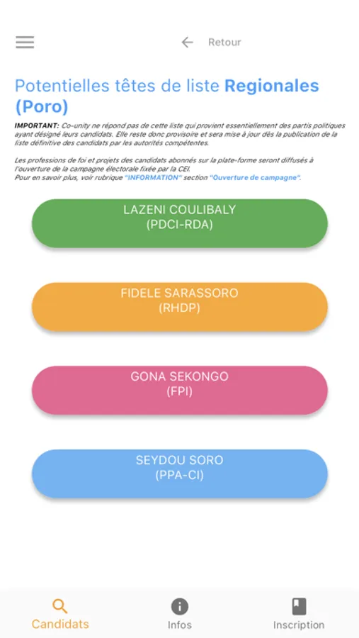« Olifant » est l'application citoyenne de référence qui permet de rendre visible le principe de profession de foi, le projet de société et le programme des candidats à une élection de sorte à les faire éclore, les rendre digeste et facilement accessibles (traduction en langage compréhensible par tous sous différents supports : textes, audios et/ou vidéos en langues locales).