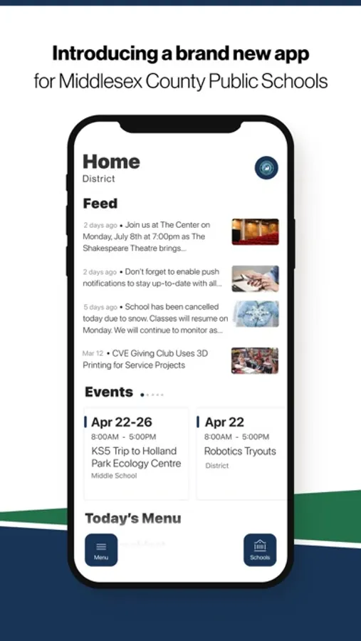 The event section shows a list of events throughout the district. Users can add an event to their calendar to share the event with friends and family with one tap.