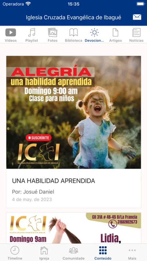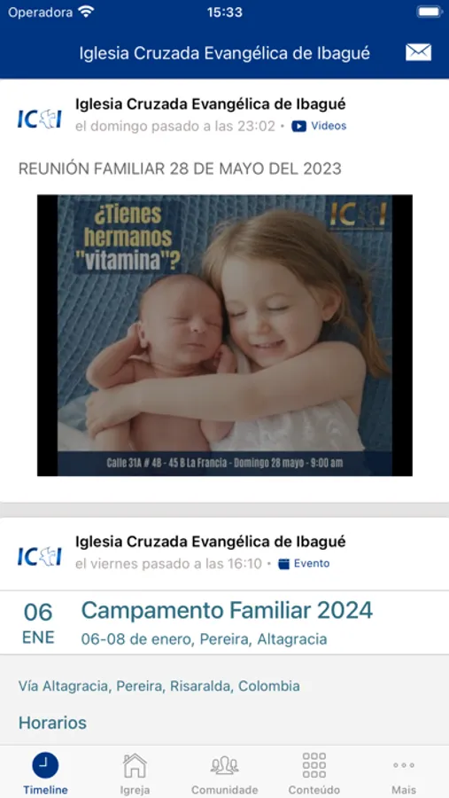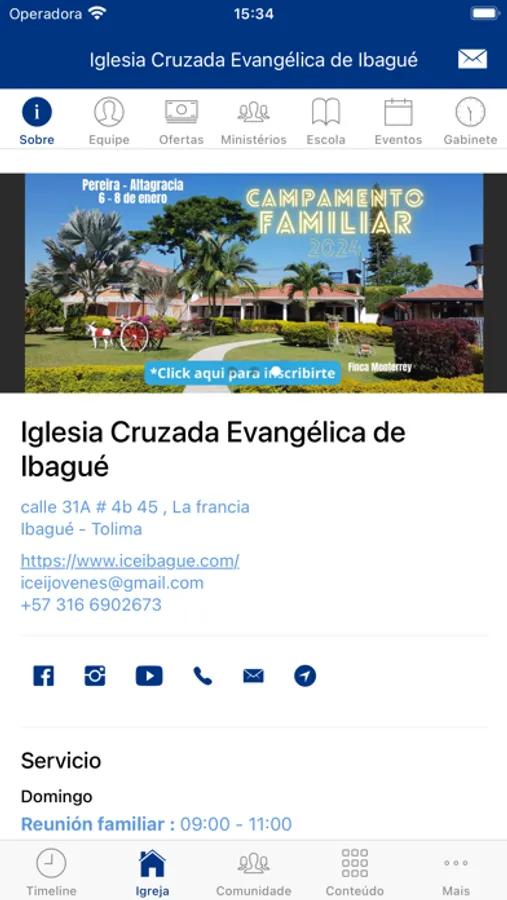 - Información de la iglesia (dirección, teléfono, sitio web, redes sociales, pastores)