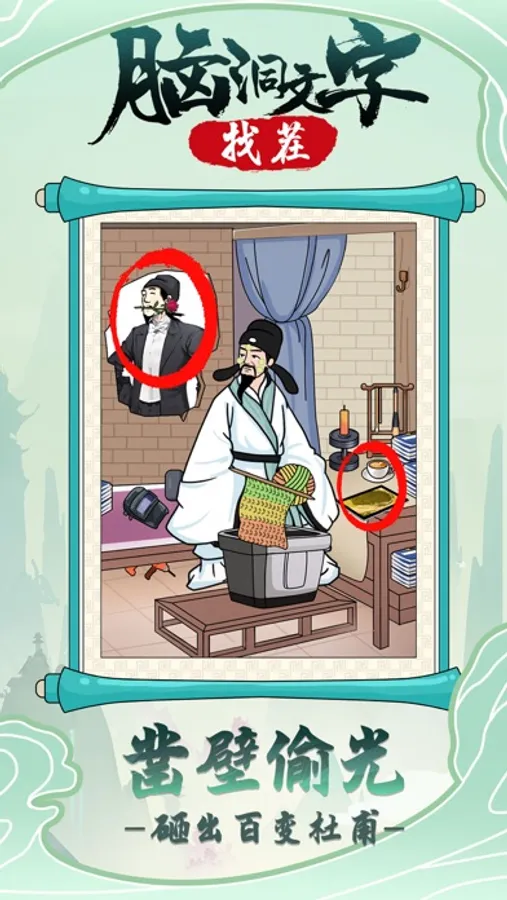考验你文化功底和网络功底的时候到了,本游戏融合众多网络热词热梗,制作了多个关卡,游戏中你将利用多年积攒的知识和热梗从众多物品中找出目标,各种意想不到的物品都可能是最终答案,还有更多关卡等着你来挑战。