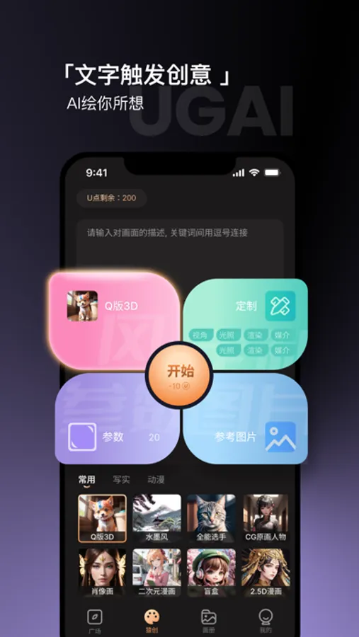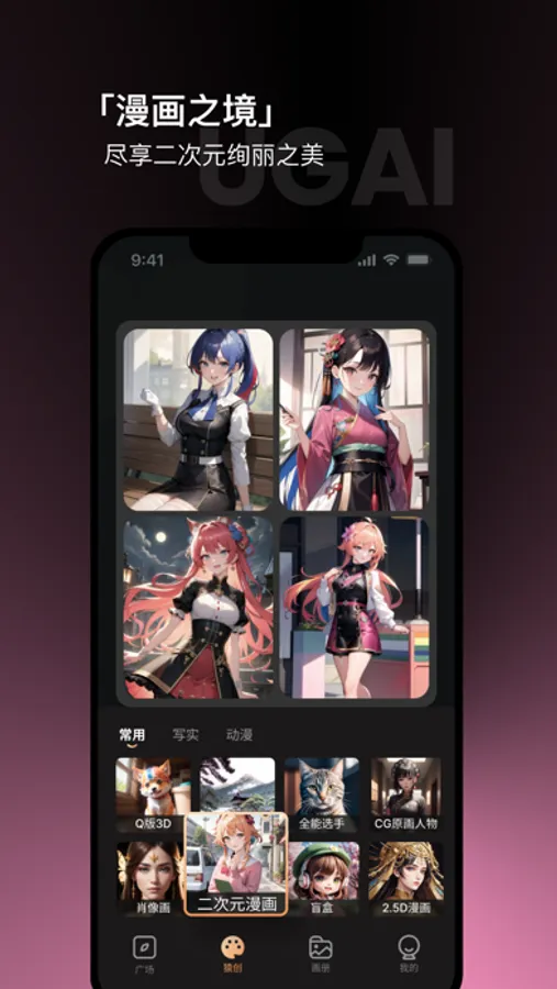 欢迎来到UGAI!我们为您带来了一款简单易用、充满创意的应用程序,利用先进的人工智能技术为您提供多样风格的图片生成体验。
