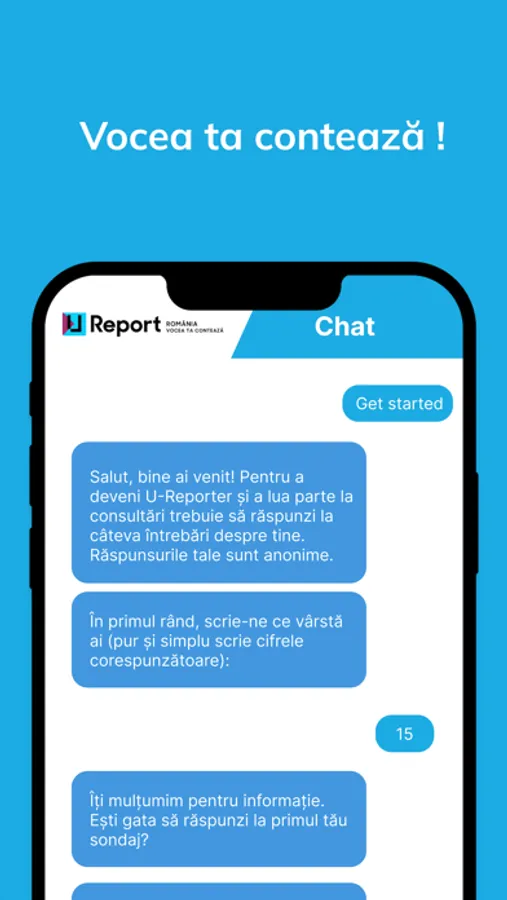 U-Report Romania is a consultation mechanism developed by UNICEF that invites children and young people to talk about issues that are important to them. In order to develop solutions, it is utilized to identify the difficulties that kids and teenagers face as well as the issues that their communities are dealing with. Aside from the consultation component, U-Report Romania allows the users to explore articles about trending topics such as health, education and environment.