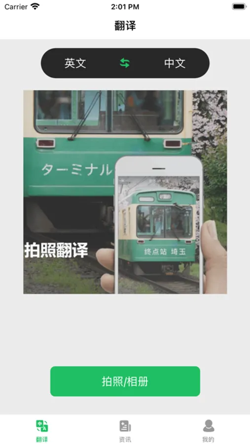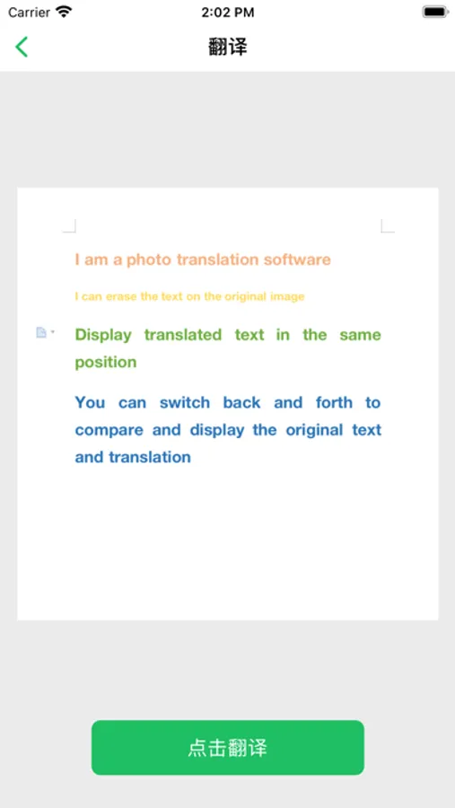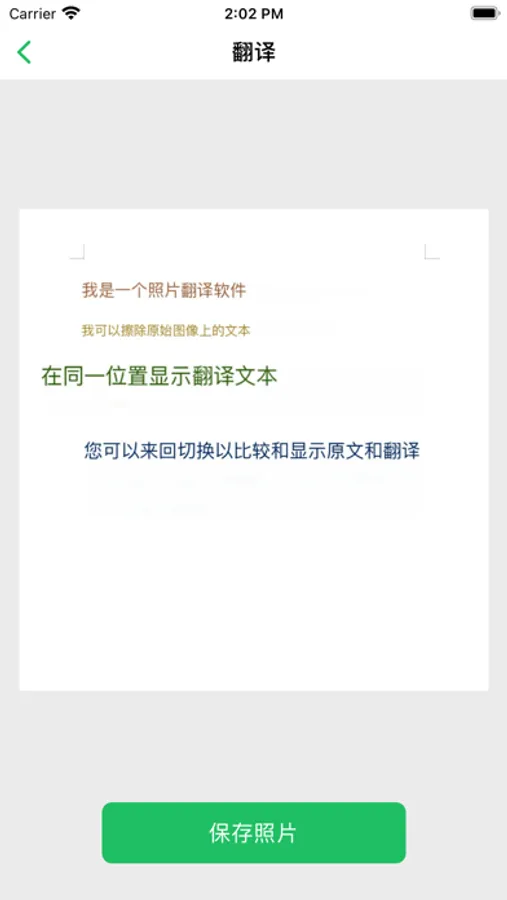 拍照翻译:拍照片直接翻译,译文直接在原场景显示,可来回切换查看原文和译文。