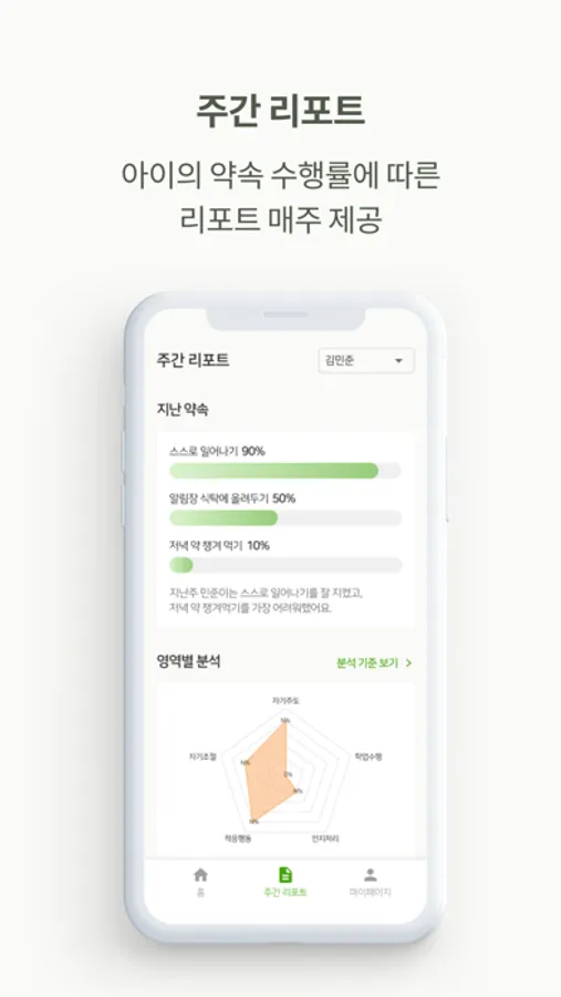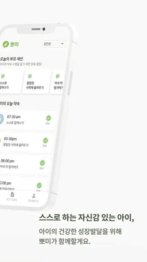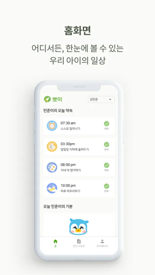 뽀미(부모용)은 어린이가 선택한 약속과 주차 별 약속 수행률에 대한 정보를 제공합니다. 어린이가 뽀미와의 약속을 잘 수행하고 있는지 함께 확인하고, 어린이의 기본 생활 습관 형성을 도와주세요.