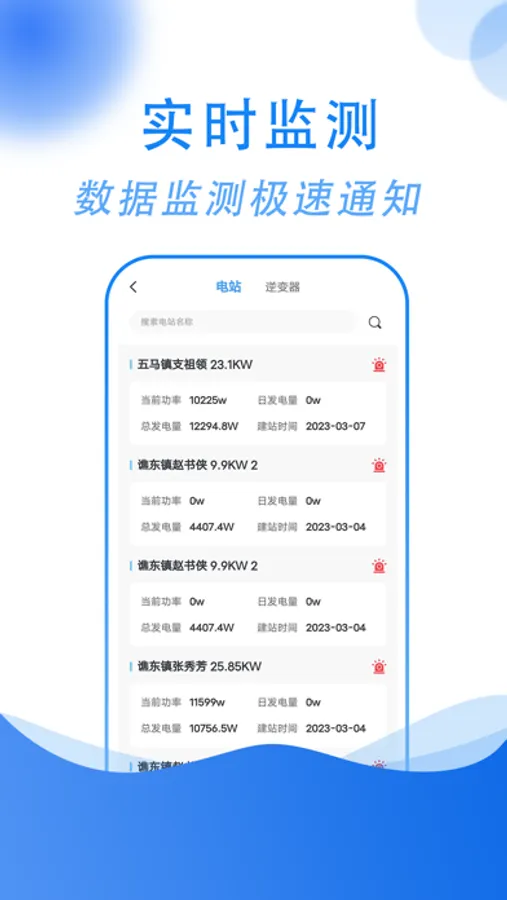 通过此app,可以定位各个户用电站并且可以查询到户用电站周围状况、发电情况,装机容量。同时可以查讯到电站发电量以及故障报警等功能并且可以及时通知运营维护人员前往维修。