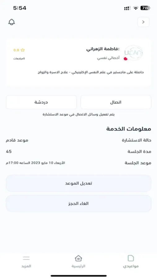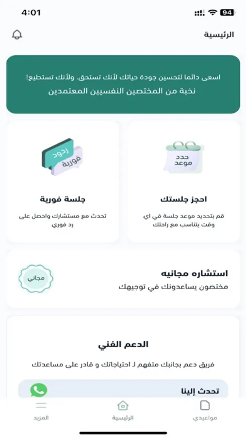 - تنفيذ الجلسة مع المختص عبر المكالمات المرئية أو الصوتية أو الرسائل النصية داخل التطبيق