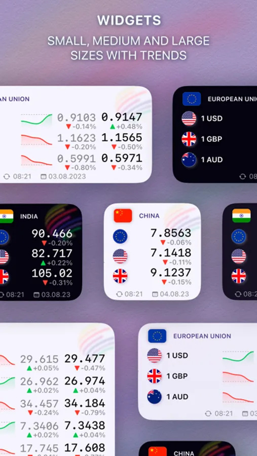 Visualize currency fluctuations effortlessly with our stunning widgets! Get exchange rate updates on all widgets and enjoy mini-trends on large and medium-sized widgets.