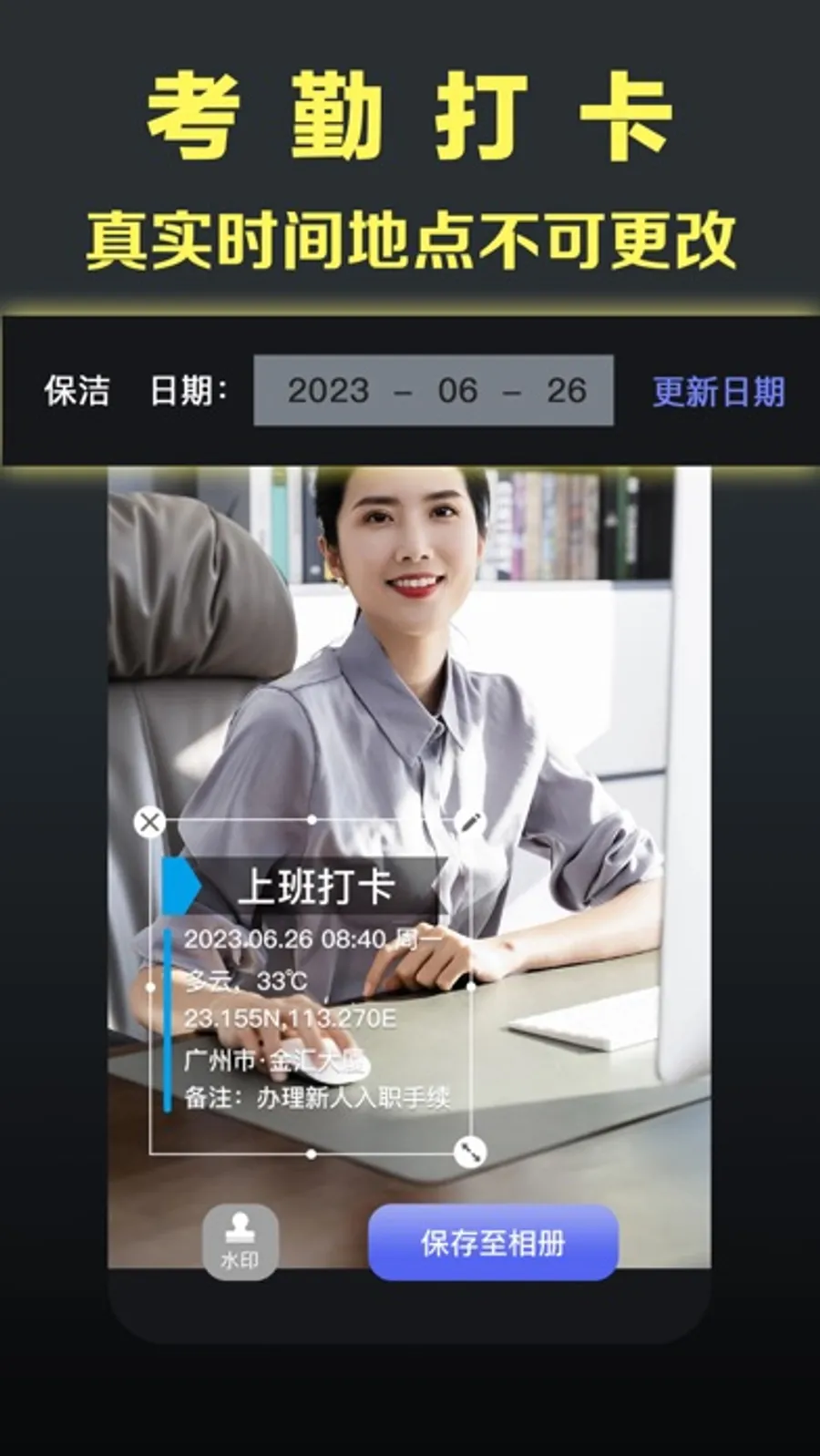时间/定位精准,轻松打卡,记录生活与工作,定位时间实时更新,专业的拍照APP,值得信赖!