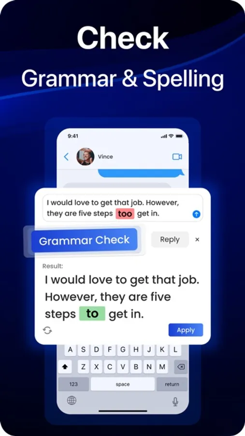 AI Keyboard Writing Assistant can check grammar of your text writing. Spell check your writing, type ai to provide correct solutions. Use it for grammar check, grammarly tool and fix grammar punctuation. Quickly correct your spelling like grammarly go.