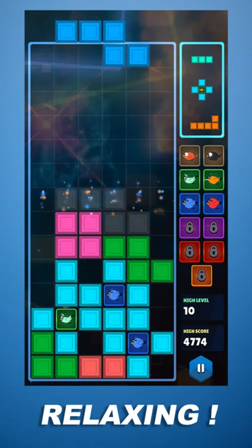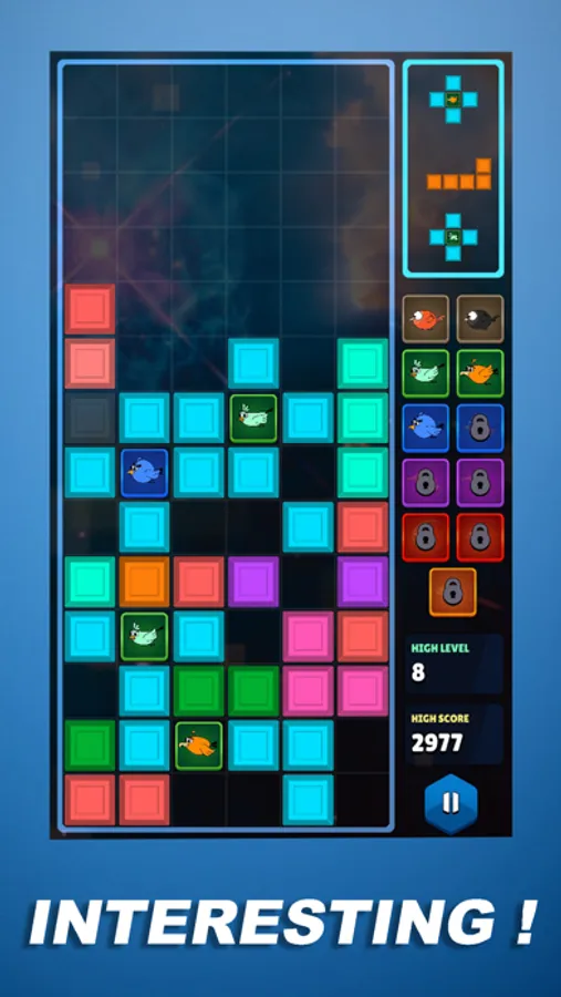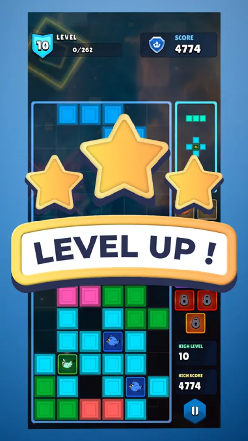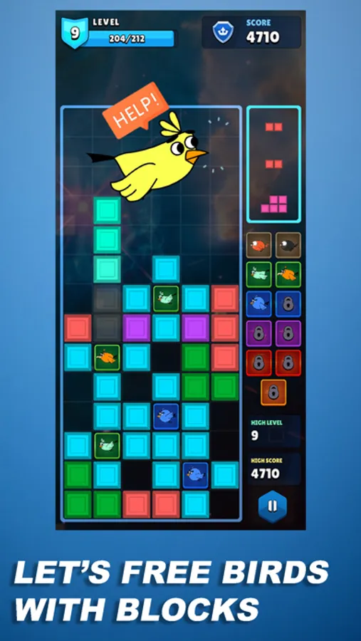 - When the horizontal row is filled, that row is deleted and scored, if the block has birds, rescued birds, you get more points and accumulate points to level up.