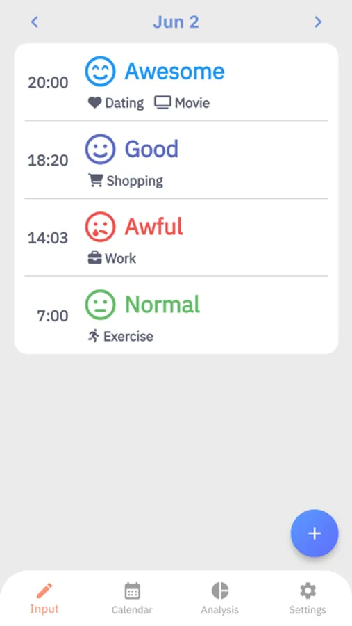 The registration process is incredibly simple! Just open the app, select your current mood, and press the save button. For those who want to provide more detailed records, we also offer a memo field and activity tags.