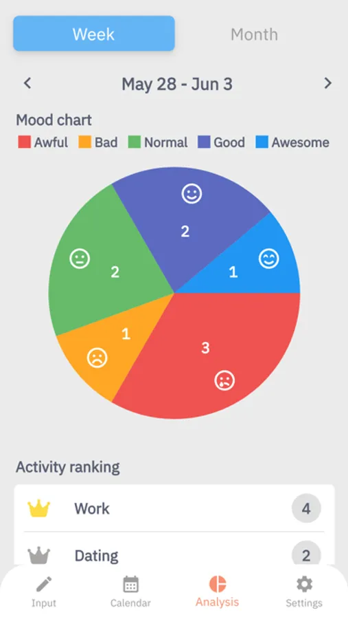 On the "Analysis" screen, you can check your activities for a week or a month in a ranking format, and view the percentage of different moods in a graph.