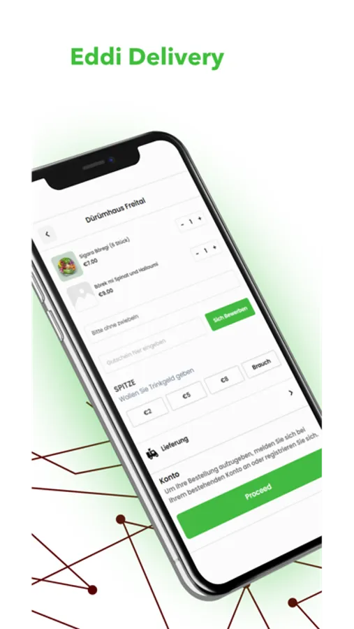Einfach zu bedienen und mit einer großen Auswahl an Restaurants und Gerichten, bietet Eddi Delivery eine bequeme Möglichkeit, deine kulinarischen Vorlieben zu entdecken und zu genießen. Stöbere durch eine vielfältige Auswahl an Restaurants in deiner Umgebung, durchsuche die umfangreichen Menüs und wähle deine Lieblingsgerichte aus.