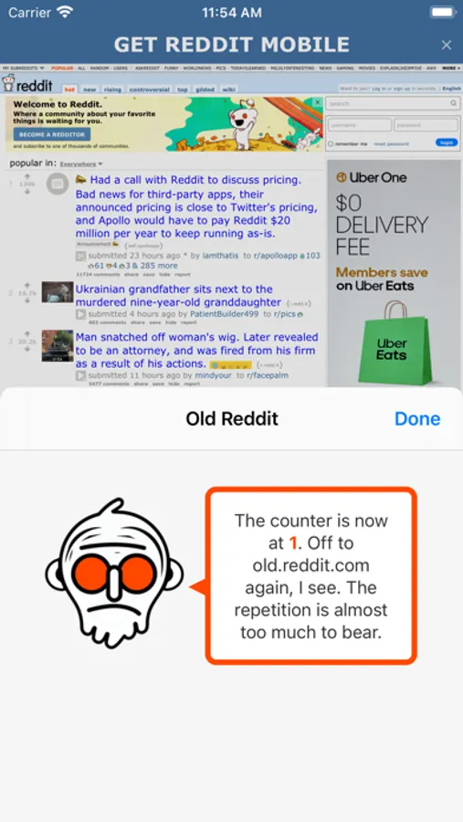 Every time you visit Reddit, the extension increments a counter and offers a disheartening comment about the futility of your actions. The message changes based on the counter's value, a feature which I suppose is intended to provide some variety, as though that would alleviate the tedium of existence.